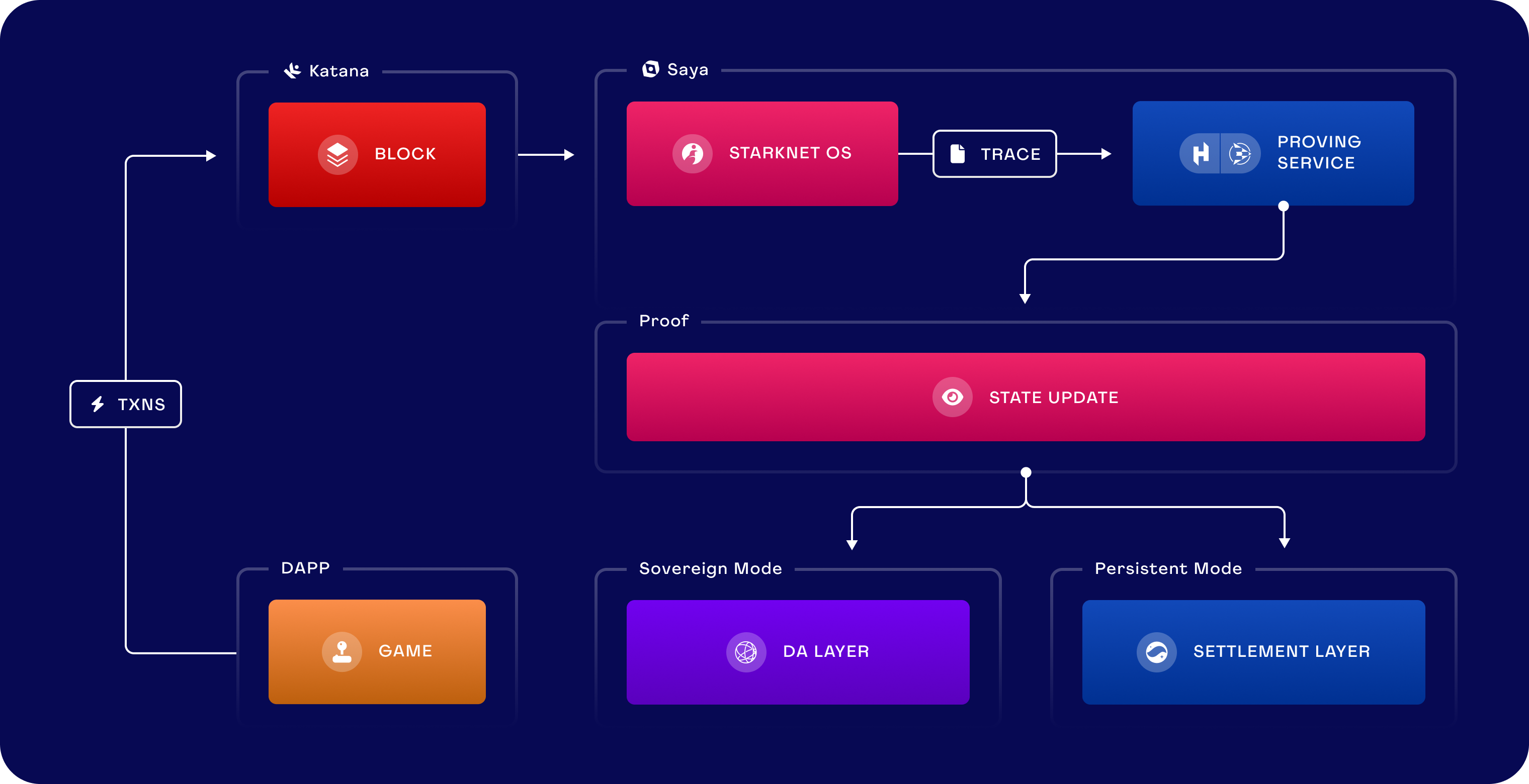 Sovereign mode: Saya will fetch the blocks from Katana and will post the proof and associated compressed state diff to a data availability layer.
